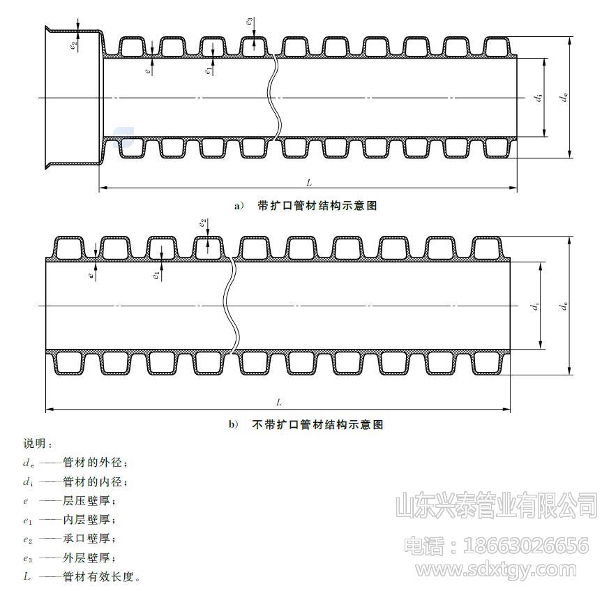 產(chǎn)品名稱:HDPE雙壁波紋管,聚乙烯雙壁波紋管 材料材質(zhì):PE/聚乙烯 執(zhí)行標(biāo)準(zhǔn):GB/T 19472.1 規(guī)格型號(hào):DN/ID160-500mm(內(nèi)徑系列) 環(huán)剛度等級(jí):SN4,SN8 外觀顏色:外觀內(nèi)壁均為黑色 產(chǎn)品長(zhǎng)度:6米/支 連接方式:彈性密封圈 生產(chǎn)廠家:山東興泰管業(yè)有限公司 聯(lián)系電話:186 6302 6656 (高經(jīng)理) 適用溫度:長(zhǎng)期使用溫度45℃以下的埋地排水、排污和通訊護(hù)套管用管材 產(chǎn)品介紹: HDPE雙壁波紋管,簡(jiǎn)稱PE波紋管,80年代初在德國(guó)首先研制成功,是一種以聚乙烯PE為原材料,經(jīng)過(guò)擠出和特殊的成型工藝加工而成,內(nèi)壁光滑,外壁為封閉波紋型的一種新型輕質(zhì)管材,因采用了特殊的中空環(huán)形結(jié)構(gòu),具有優(yōu)異的環(huán)剛度和良好的強(qiáng)度與韌性。具有重量輕、耐高壓、韌性好、施工快、壽命長(zhǎng)、摩擦系數(shù)小、連接方便可靠等特點(diǎn)。其優(yōu)異的管壁結(jié)構(gòu)設(shè)計(jì),與其它結(jié)構(gòu)的管材相比,成本大大降低。雙壁波紋管已成為管道領(lǐng)域“以塑代鋼”的首選管材,它克服了混凝土管,鑄鐵管等安裝難度大、易銹蝕、水流阻力大、滋生細(xì)菌、壽命短的缺點(diǎn)。 PE雙壁波紋管是為了在節(jié)省原材料而不致使管材的環(huán)剛度下降的前提下,對(duì)管材截面進(jìn)行優(yōu)化設(shè)計(jì)的一種內(nèi)壁光滑平整、外壁為梯形或弧形波紋狀、內(nèi)外壁波紋間為中空、采用擠出成型工藝制成的管材。因?yàn)槠渲饕牧蠟榫垡蚁≒E),故簡(jiǎn)稱為PE雙壁波紋管。 PE雙壁波紋管內(nèi)徑系列管材尺寸(單位:mm) 公稱內(nèi)徑 DN/ID 最小平均內(nèi)徑 dim,min 最小層壓壁厚 emin 最小內(nèi)層壁厚 e1,min 最小外層壁厚 e3,min 最小結(jié)合長(zhǎng)度 Amin 200 195 1.5 1.1 0.9 54 300 294 2.0 1.7 1.0 64 400 392 2.5 2.3 1.8 85 500 490 3.0 3.0 2.1 96 PE雙壁波紋管的優(yōu)點(diǎn) : 1、 產(chǎn)品結(jié)構(gòu)獨(dú)特,抗壓能力強(qiáng),具有足夠安全可靠的環(huán)剛度; 2、 節(jié)約原材料,用同樣的原材料做同一外徑的管材時(shí),波紋管比實(shí)壁管節(jié)省30%以上的原材料; 3、 重量輕,比重小于鑄鐵管和水泥管的50%; 4、 內(nèi)壁表面光滑,不易產(chǎn)生沉積,摩擦系數(shù)??; 5、 PE雙壁波紋管采用柔性密封圈連接,密封性能好,耐腐蝕,不結(jié)垢; 6、 具有良好的撓曲心梗,可適應(yīng)土壤的不均勻沉降; 7、 連接便捷、施工進(jìn)度快,與傳統(tǒng)水泥管相比,采用PE波紋管可以提高3倍以上安裝進(jìn)度,明顯降低施工費(fèi)用,縮短施工周期; 8、 生產(chǎn)成本低,埋地使用可達(dá)50年以上,綜合經(jīng)濟(jì)性能優(yōu)越。 PE雙壁波紋管的物理力學(xué)性能 項(xiàng)目 要求 環(huán)剛度/(kN/m2) SN4 SN8 ≥4 ≥8 沖擊性能(TIR)/ % ≤10 環(huán)柔性 管材無(wú)破裂,兩壁無(wú)脫開(kāi),內(nèi)壁無(wú)反向彎曲 烘箱試驗(yàn) 無(wú)分層,無(wú)開(kāi)裂 密度/(kg/m3) ≤1180 氧化誘導(dǎo)時(shí)間(200℃)/min ≥20 蠕變比率 ≤4 PE雙壁波紋管的應(yīng)用領(lǐng)域 : 1、 市政工程,用于建筑物的地下排水管、排污管、輸水管、通風(fēng)管等; 2、 公寓、住宅小區(qū)、農(nóng)村地下埋設(shè)排水排污; 3、 電器電信工程,作為電力電纜、通訊光纜、通訊信號(hào)電纜的保護(hù)管; 4、 工業(yè),由于聚乙烯材料具有優(yōu)良的耐酸、堿及耐腐蝕能力,結(jié)構(gòu)壁管可用于化工、醫(yī)藥、環(huán)保等行業(yè)的給水和排水管道; 5、 農(nóng)業(yè)、園林工程,用于農(nóng)田、果園、茶園以及林帶排灌,可節(jié)水70%,節(jié)約用電13.9%,也可用于農(nóng)村灌溉; 6、 道路工程,可用作鐵路、高速公路、高爾夫球場(chǎng)、足球場(chǎng)等的滲、排水管; 7、 礦場(chǎng),用作礦井的通風(fēng)、送風(fēng)管、排水管。 PE雙壁波紋管的連接: HDPE雙壁波紋管管道接頭應(yīng)采用彈性密封橡膠圈連接的承插式接口,橡膠圈接口應(yīng)遵守下列規(guī)定: 1、接口前,應(yīng)先檢查橡膠圈是否配套完好,確認(rèn)橡膠圈安放位置及插口的插入深度。 2、接口時(shí),先將承口的內(nèi)壁清理干凈,并在承口內(nèi)壁及插口橡膠圈上涂潤(rùn)滑劑,然后將承插口端面的中心軸線對(duì)齊。 3、接口方法應(yīng)按下述程序進(jìn)行:DN400及其以下管道,先由一人用棉紗繩吊住被安裝管道的插口,另一人用長(zhǎng)撬棒斜插入基礎(chǔ),并抵住該管端部中心位置的橫擋板,然后用力將該管緩緩插入待安裝HDPE雙壁波紋管管道的承口至預(yù)定位置;DN400以上管道可用兩臺(tái)手扳葫蘆將管節(jié)拉動(dòng)就位。接口合攏時(shí),管節(jié)兩側(cè)的手扳葫蘆應(yīng)同步拉動(dòng),使橡膠密封圈正確就位,不扭曲、不脫落。 PE雙壁波紋管貯存方法: HDPE雙壁波紋管應(yīng)貯存于常溫干燥庫(kù)中,不宜暴曬。 HDPE雙壁波紋管應(yīng)平放,堆碼高度不得超過(guò)4m。 HDPE雙壁波紋管不允許與有毒有害物質(zhì)混放,應(yīng)遠(yuǎn)離熱源,在存放處應(yīng)設(shè)置醒目的禁火標(biāo)志。 存放期自生產(chǎn)之日起,一般不得超過(guò)2年。